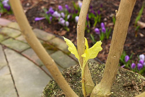 After a winter in the dark basement, a brugmansia looks pretty ragged. Hard to believe there is any life in it, but the pale green shoot at the base shows promise.