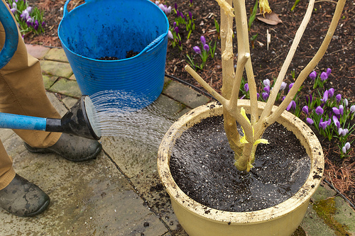 - Repot with pre-moistened, fresh potting soil. Do not use garden soil because it will not drain freely. Mix some slow-release granular fertilizer into the soil. as you fill the pot.